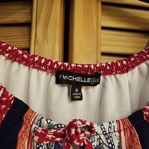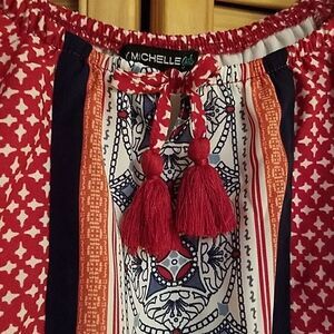 This adorable multicolored short romper is light weight and breathable. Can be worn off the shoulder with adjustable tassels at top. Elastic waistband. Machine washable. Like New