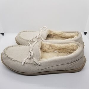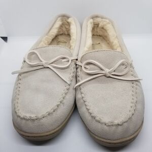 MySlippers Moccasin suede slippers with faux fur lining in Beach Beige US 9