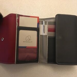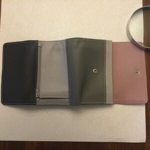 This wallet is gray, cranberry, and charcoal colored on the exterior, and also has some dusty pink on the interior. It snaps closed. Open the charcoal gray flap, and the interior has 5 slip pockets, a pen in a vertical pocket, an ID window, a pocket behind the ID window, and two more pockets behind the vertical slip pockets. At the top of the wallet there are two long, deep, horizontal pockets for bills. Under the cranberry flap there are 2 pockets, one of which has zipper compartment. The back exterior has a zip pocket also. New without tags.