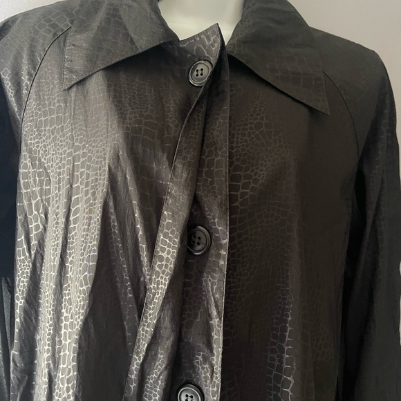 Perfect for stylish outings. The coat features a textured pattern, possibly a faux croc or reptile print, and has button closures. Mycra Pac coats are designed with travel in mind, often being lightweight and water-resistant.