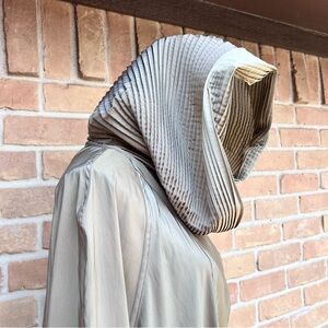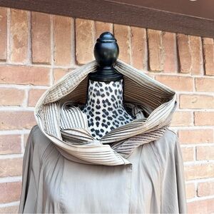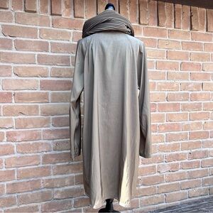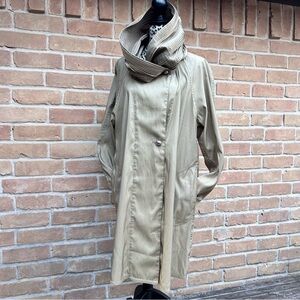 Reversible Donatella weatherproof raincoat. Lightweight and easy to pack for travel. Has a few areas of light superficial spots as noted in pictures. Barely visible to first or second glance. This jacket has really cool geometry from depleted Hood. Is a quiet luxury, apocalyptic, avant-garde, art, travel, steam punk.