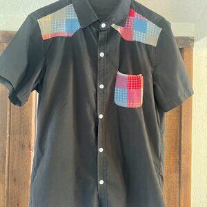 Black, short-sleeved one of a kind European shirt. Patchwork is minimal with a blend of hippie and punk aesthetic.