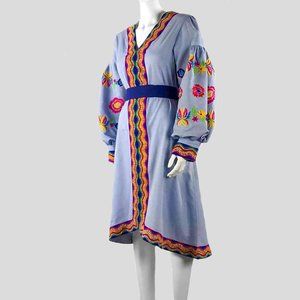 Mynah Designs by Reynu Taandon light blue cotton dress with multi-colored zig-zag embroidery on front panel and hem. Floral embroidered bell sleeves. Dark blue knotted tie-up belt with multi-colored lace and tassel hanging at the edges. Side zipper. Cut for a relaxed fit.