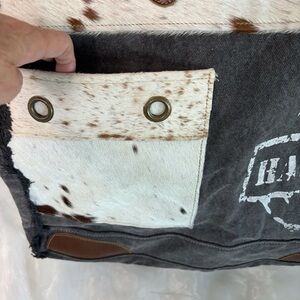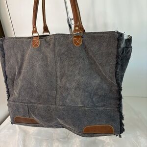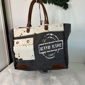 Army green canvas and leather weekender bag, hand made logo, 10" leather shoulder strap. Front cowhide pocket and an inside pocket. Perfect size for a carry on.