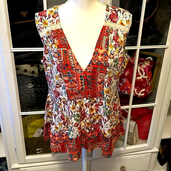 Cute bohemian top by Bohera Myra Bag. Lace and button detail and elastic across the back to gather the waist. Size L. Pit pit is approximately 20 inches. This is new without tags.