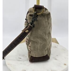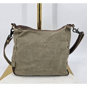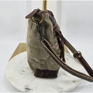 Stylish and functional, this genuine Myra Bag features a Southwestern woven front panel, chocolate leather trim, and durable khaki canvas back. Fully lined with interior pockets. Adjustable strap for shoulder or crossbody wear. Earthy and rustic — pairs beautifully with Autumn palette tones.