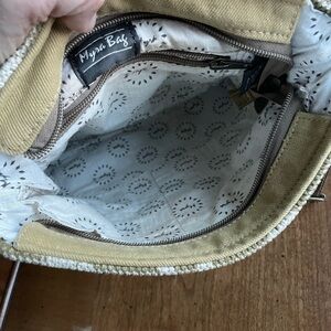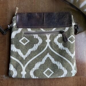 Myra Bag rustic cotton canvas and leather crossbody bag. Cute boho bag with weathered leather flap and patterned canvas body. Cream and olive green colorway coordinate well with a wide range of outfits. Flap and zipper on top and zipper pocket in back. Preowned with some patina to the leather. One side of the strap has pulled out a bit where it attaches to the bag. See photos for details. Made in India.