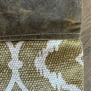 Myra Bag handmade crossbody pouch with a leather upper detail.measure approximate 11.5” long X 9.75” high. Excellent pre-owned condition with no stains or holes. Comes with removable wrist strap.
