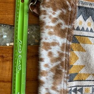 Myra Bag Crossbody with geometric pattern and Calf Hair Accents This Myra Bag crossbody bag's geometric pattern and natural fur patch add a unique touch, making it a stylish choice for any casual outing. Only used once great condition
