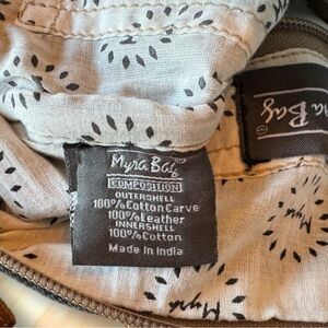 • Interior: fabric lining with “Myra” print, zippered pocket, and two open pockets