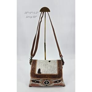 Rustic boho meets artisan craftsmanship. This genuine leather and cowhide crossbody features a beautifully embossed flap and a woven Southwest-inspired base in warm Autumnal tones. A perfect statement piece for everyday or festival wear.