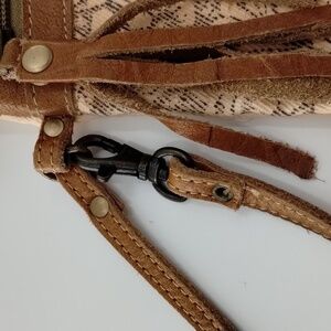 Myra Bag peach and brown large wristlet canvas/leather printed inside 9"x 7"