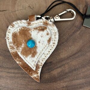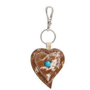 This enchanting hair-on hide leather fob depicts a lovely double heart shape, with a single turquoise stone accent. Metal lobster-style clasp and heavy-duty keyring will keep everything secure.