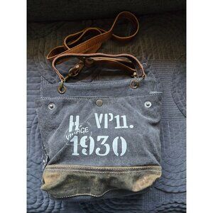 This Myra crossbody bag blends rugged canvas and leather materials for durability and style. Featuring a vintage-inspired 1930 print on the front and intricate pattern on the back, it offers spacious interior compartments for organization. Adjustable faux leather straps ensure comfort and versatility.