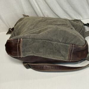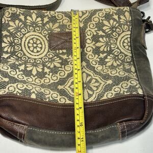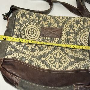 The Myra Bags Women's Freaky Upcycled Materials Shoulder Bag Crossbody is a casual and stylish purse made from a combination of canvas, leather, and rug materials. This shoulder bag features a unique brown and grey exterior color with a top zipper closure for security. The bag has a size of 11 inches in height, 11 inches in width, and 3 inches in depth, making it a convenient accessory for everyday use. It is fully lined and includes interior and exterior pockets for organization. Made in India, this bag by Myra Bags is environmentally friendly and showcases a distinctive design.