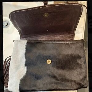 Fringe, Cowhide, & Aztec Design with a Top Zipper and Front Snap Closure with Back & Inside Pocket