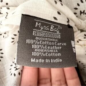 From Myra Bags. Preowned in good condition with no stains or tears. Made of up-cycled materials --Cotton Rug, Canvas, Leather, Cowhide. Zip compartment with 2 slip pockets and 1 zip pocket; Fully lined interior; Zip pocket on the front and back