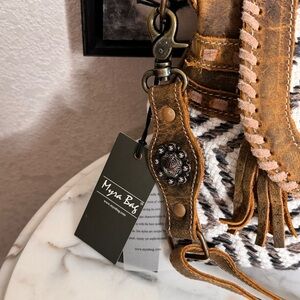Introducing the Sand Weaver Flapped Shoulder Bag S-7356, a stylish and functional addition to your handbag collection. This 13” x 10.5” Myra Bag is designed with a trendy black and cream tribal rug front and durable olive canvas back, perfect for adding a unique touch to any outfit. The crossbody adjustable leather strap and accents provide both comfort and a touch of luxury, allowing you to carry your essentials with ease. Whether you're running errands or heading out for for a night on the town, this chic shoulder bag offers the perfect combination of style and practicality. Don't miss out on the opportunity to elevate your accessory game with the Sand Weaver Flapped Shoulder Bag S-7356.The bag has factory distressed leather, with whip stitching on the flap.