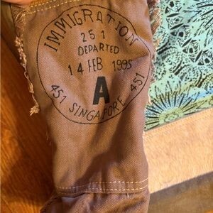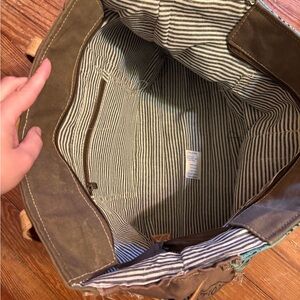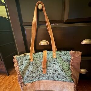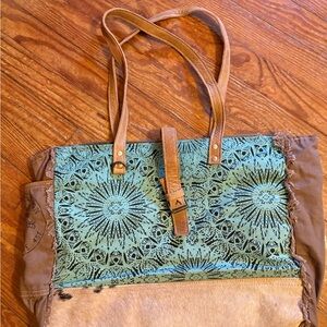 Stylish brown canvas tote bag featuring leather handles and a vintage print design. Perfect for everyday use.