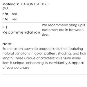 Myra brand hairon cowhide leather slip on shoes with gold chain. These are handcrafted in India, and are a size 7. These are true to size 7. A super cute style with the gold chain detailing, and each pair is unique due to it being made with natural materials. No one will have the exact same shoes that you do. These are a medium to wide width shoe, narrow feet probably will not be great in these. I like the cork bottom and then the nonslip sole underneath that. This leather will definitely form to your foot the more that you wear it. All Myra leather shoes and boots tend to do that, and it makes them super comfy the more that you wear them. New and will arrive in their own dust bag that you can store them in without the need for a large box.