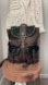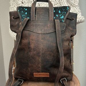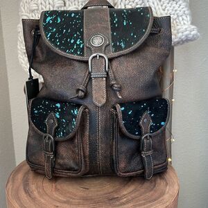 This incredible bag offers so much! Constructed of deep chocolate leather, it features stunning accents of turquoise foil treated hair-on hide which practically shimmers.Two handy front pockets, features buckles in antiqued metal.Under the top flap,the roomy interior will hold all your essentials,held snug and secure by zippers and drawstrings.Matching carrying and shoulder straps in chocolate leather complete this gorgeous bag.