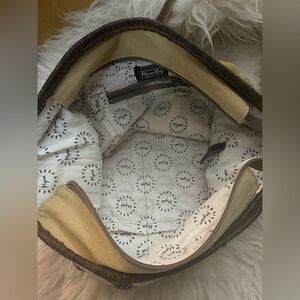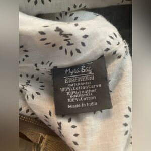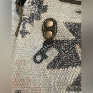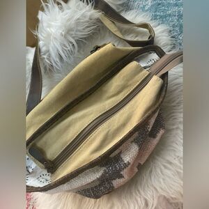 This funky bag is made from rug, leather, and canvas with a Navajo print.