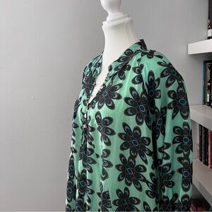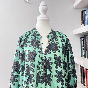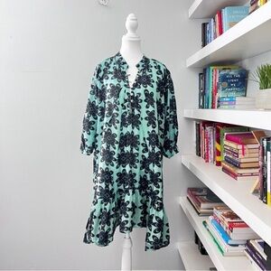 Button details at the top, three-quarter sleeves, and a ruffled hem. This beautiful dress is lightweight and flowy, suitable for warm weather or casual occasions. Myrah Penaloza is known for bohemian-style clothing, often featuring natural fabrics and relaxed fits.
