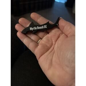 The Myrtle Beach Shark Key Chain is a metal keychain featuring a shark design in black, representing South Carolina. It serves as a souvenir from Myrtle Beach, with a functional bottle opener included in its design. The keychain is a modern collectible item, perfect for those who appreciate both functionality and aesthetics in their everyday accessories.
