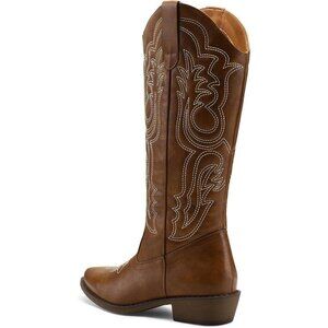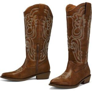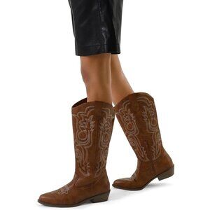 Mysoft Cowboy Boots Women Brown Mid Calf Embroidered Western Pointed Toe Boots