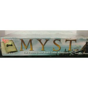 Myst- The Puzzling New Board Game Adventure. Intended for ages 10+, 2 or more players. New Sealed in box, New old Stock. Made in U.S.A. ©1998 University Games. Dimensions: 10"x 14½"x 3", 2lb 5oz