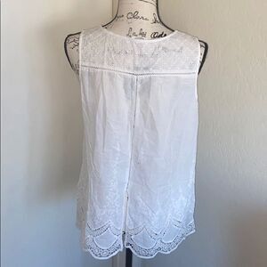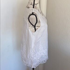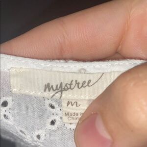 Mysteree white eyelet boho top, size medium, split on the back, sheer, pullover, gorgeous detailed eyelet design.