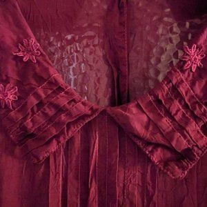 Lovely and mysterious, sweet and feminine -- throw on this somewhat sheer midi tea-length dress (over a cami liner slip maybe?) for a dreamy late summer early evening sipping Pimms in the garden or seeing your dearest friends. Single-owner dress by Davi Davich is made from sheer soft crepe rayon that is as lovely as silk but not as slick, it has a very slight soft texture. The beautiful deep rose color is flattering to all. Please note that when hand-washed it runs slightly so not recommended over a wet bathing suit.