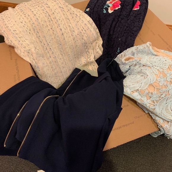 Are you handy? patient? This may be for you! It is a bundle of 5 pieces with broken zippers. Includes a skirt, some dresses, and a romper. They are all new with tags or new without tags. Brands include Harper Rose, Eliza J, Wild Honey and Love X Design.