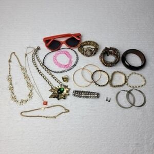 19 pieces: 10 bracelets, 5 necklaces, 2 pairs of earrings, 1 ring, and sunglasses. All are shown in photos.