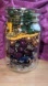 A jar filled with vibrant beaded jewelry. Features yellow, green, and purple beads with silver accents.