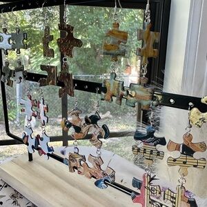 Silver double dangle jigsaw puzzle piece earrings. Lightweight and comfortable! Back of earring is original cardboard.
