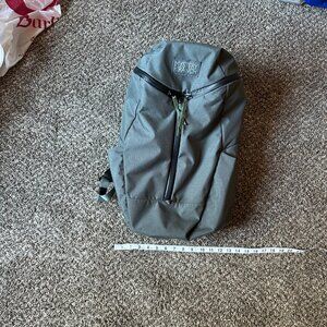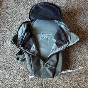 My brother purchased it on sale at REI. He didn't like it and gave it to me. It has one pocket on the top with a key fab. backpack opens like a jacket and on the left and right side there are pockets, the size is what you see is the black mesh. It has a natural curve. It comes with optional/ removable chest straps.