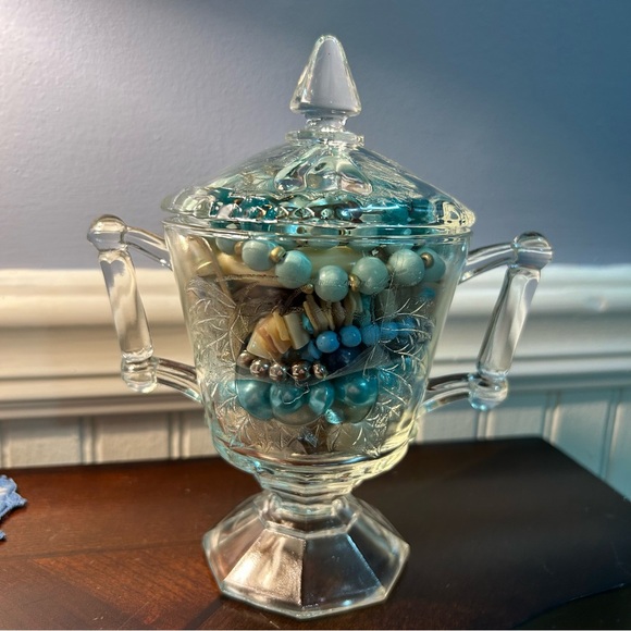 15-20 pieces of wearable jewelry, no craft. Beautiful glass candy dish with a lid. Features intricate designs and a handle. Perfect for decor or storage.