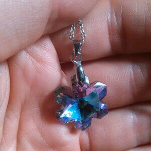 This sparkly pendant necklace features a mystic color glass snowflake shaped crystal. Many faceted cuts in the piece reflect a lot of light. The pendant is brass set in silvertone, and the chain is stainless steel. The chain is approximately 20 inches in length. Brand new.