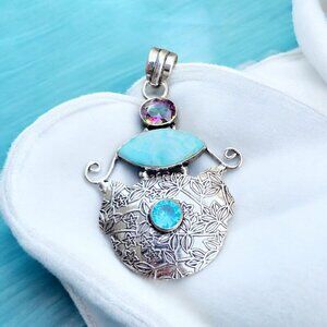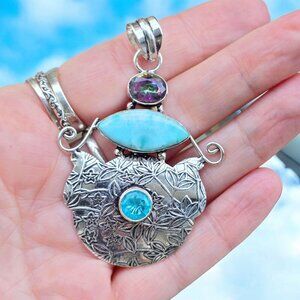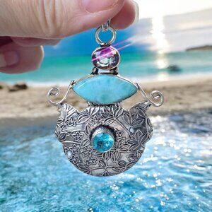 Mystic Fire Topaz, Larimar & Swiss Blue Topaz Forged In Sterling Silver Pendant