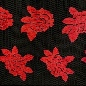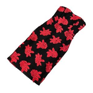 Stunning bodycon dress features mesh overlay with red rose appliqué. Sweetheart neckline. Strapless. Back slit. Zipper closure. Fully lined. Nylon mesh w/poly lining = some stretch for a second skin fit. So sexy!