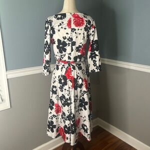 floral dress, midi dress, fit and flare dress, 3/4 sleeve dress, red floral dress, black floral dress, white floral dress, boat neck dress, casual dress, garden party dress, womens dress, classic dress, spring dress, summer dress