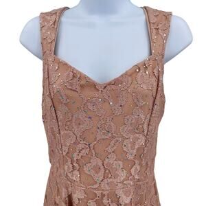 Mystic Pink Lace Sparkle Fit & Flare Mini Dress, women's medium. This sleeveless dress features intricate lace detailing, a sparkle finish, and a flattering fit-and-flare silhouette. The stylish cut-out design adds a touch of elegance, making it perfect for special occasions and evening events.