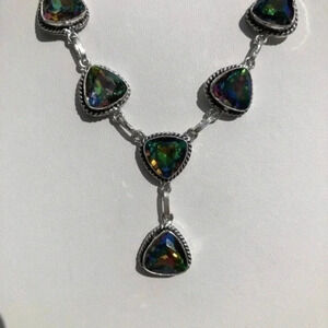 Gorgeous Mystic topaz set in 925 Sterling silver overlay. Necklace is approximately 19 inches long and earrings are approximately 1.25 inch drop. I ship fast!