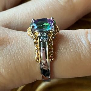 This pretty ring is made with a 10x8 mm genuine mystic topaz stone. The ring additionally has blue Moissanite accents. Moissanites are a lab created diamond replacement that are very durable and sparkly. On the Mohs scale of hardness, the Moissanite is a 9.5. The total gemstone carat weight on this ring is 3.15. The ring is set in solid .925 sterling silver with a rhodium finish, making it perfect for daily wear. The ring additionally has yellow gold vermeil accents for added beauty. The ring in the photos is the actual one you will receive, so please see photos for quality and measurements. Size 9.