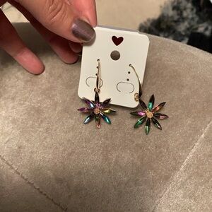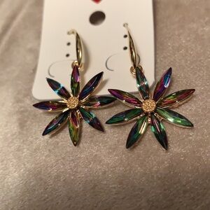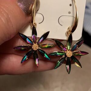 These earrings are absolutely stunning. The stones in them are a mystic rainbow color that shows various shades of green and pink and purple and blue and they’re in a floral pattern on a gold earring. They measure less than 2 inches in total length. The crystal gem part is just smaller than a quarter. These catch the light in so many beautiful ways. You’ll love wearing these! Brand new on the card. Lightweight, won't pull your ear down.