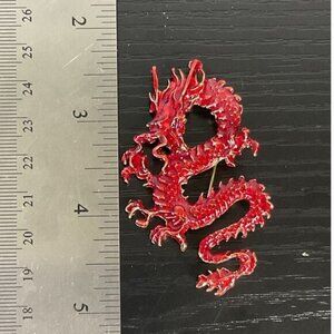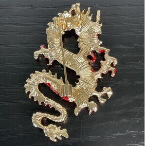 This intricately designed dragon brooch pin showcases a striking combination of red enamel and gold-tone accents. Its dynamic and serpentine form embodies a sense of mystique and power, making it an eye-catching accessory. The brooch's vivid color palette and detailed craftsmanship ensure it stands out as a statement piece for any outfit.