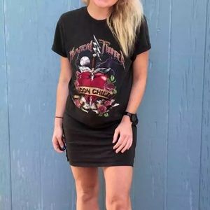 Metal rock style ‘Mystical Thunder Moon Child’ graphic printed short sleeve black t-shirt dress.