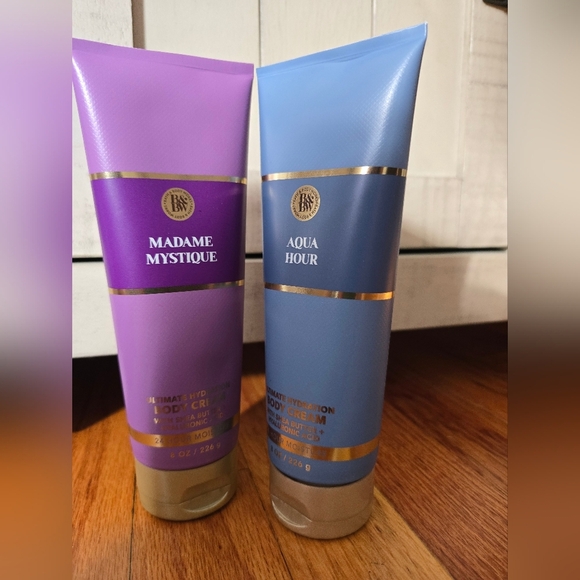 Indulge in luxurious hydration with Mystique Boutique's body cream duo. Rich formula for soft, nourished skin. Elegant purple and blue design.