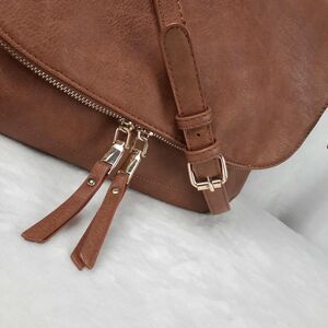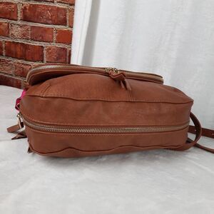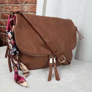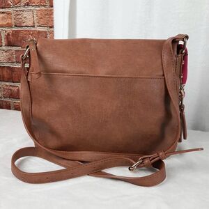 This is a gorgeous elegant brown faux leather shoulder bag by Mystique that is in like new condition inside and out. This bag has a beautiful smooth faux leather finish, a fold over flap with a built-in zipper pocket, a large slip pocket on the back, a faux zipper around the sides and bottom for added detail and an adjustable Crossbody strap.